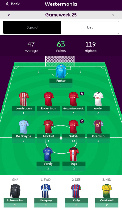 I made a conscious effort to not put too much conscious effort into GW25. Mane was knacked, and a few pontificators out there suggested to keep him as he’ll be back in a couple of weeks, maybe even just the one week, but it was clear to me that I needed to make a change to avoid going full Nigel (i.e. become irrelevant). I jumped off the Sadiowagon one stop before Shattered Dreams Parkway, crossed the platform and boarded The Salah Express, calling at Stop Rot, Redemption and due to arrive in to Success Central at Gameweek 38.